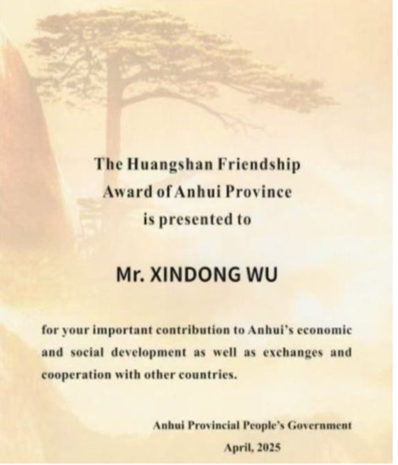 2025年5月12日上午,安徽省科技创新大会在合肥隆重召开。大会对在我省经济社会发展及国际合作交流中作出突出贡献的外国专家进行表彰。来自我校计算机与信息学院(人工智能学院)的澳大利亚籍专家吴信东教授,荣获第十六届“安徽省黄山友谊奖”。此次共有20位外国专家获此殊荣。